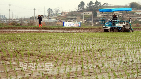 영광군 친환경쌀이 수도권 학교급식에서 최고의 인기를 끌고 있다는 반가운 소식이다. 추석 때쯤 햅쌀을 수확하기 위해 시작한 염산면 오동리 은희삼씨 농가의 첫 모내기에서 정기호 군수가 이앙기로 모를 심고 있다.