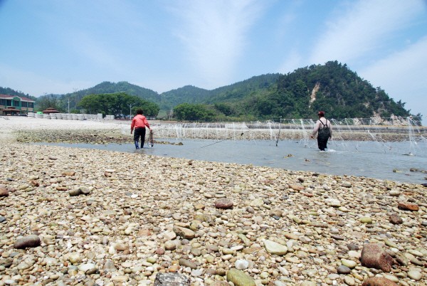 동글동글 새하얀 몽돌이 해변에 수북이 쌓인 송이도는 영광의 대표적인 아름다운 섬, 여름이면 수많은 방문객들에 더욱 인기다. 청정해역 송이도 앞바다에서 그물에 걸린 물고기를 걷어올린 노부부.