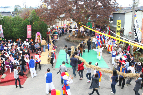 특히, 둘째 날 마을주민 수십 명이 풍물패와 함께 지푸라기를 꼬아 만든 두께 30여센치, 길이 80여 미터의 용줄을 매고 마을내 5곳에 심어진 당산나무를 찾아 돌며 굿을 하는 오방돌기(줄굿)는 재미를 더했다. 마을 한 바퀴를 다 돌고 남자와 여자가 편을 가른 줄다리는 굵은 줄이 2번이나 끊어져 웃음을 자아내기도 했다. 줄이 끊어지면 다음해에 풍년이 든다.