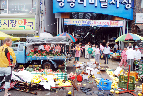 예견된 사고가 발생했다. 지난 11일 영광터미널 시장 초입에서 과일 노점상인이 군의 불법주차 단속에 대한 불만을 품고, 요즘 금값인 수박과 참외 등 과일 130만원 어치를 바닥에 내동 강이 쳤다. 상인과 노점상간의 갈등은 수십 개 월전부터 이어져 왔다. 군에 4無운동도 좋지만 터미널상인과 노점상인들 간의 갈등 해결이 우선 과제로 보인다.