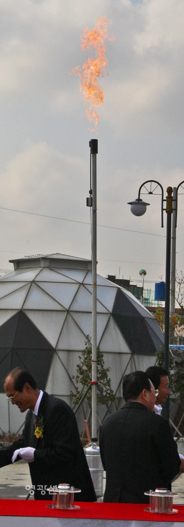 영광군이 전남도내 군단위로는 화순・장성에 이어 3번째로 도시가스 공급시대를 맞았다. 정기호 군수 등이 참석한 지난 6일 도시가스 공급 점화식에 타오른 불길이 승천하는 화룡(火龍) 모습을 하고 있다.