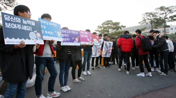 2016학년도 대학수학능력시험이 포근한 날씨 속에 12일 마무리됐다. 영광지역에서는 해룡고(남) 228명과 영광고(여) 223명 등 총 451명이 각각 9개 교실에서 수능을 치렀다. 이날 오전 선배들의 수능대박을 기원하는 후배들이 힘찬 응원을 보내고 있다.
