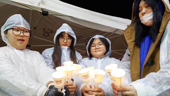 전국적으로 대통령 하야를 외치는 시국, 영광에서도 여중생들까지 거리로 뛰쳐나와 박근혜 하야를 외쳤다. 지난달 26일 밤 영광읍 남천사거리에서 2차 촛불집회 현장에서. / 청소년 기자단