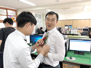 법성중학교 학생회가 지난 15일 스승의 날을 기념하여 등굣길에 교문에서 카네이션 달아드리기, 안아드리기 등 스승의 은혜에 보답했다.