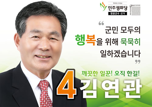 영광은 군수의 창의력과 추진력만 있다면 얼마든지 활성화 될 수 있는 여건이 있으나, 군수의 안일한 사고방식으로 우리 영광은 발전을 못하고 있었습니다. 김연관이 군수가 된다면 40여년동안 갈고 닦은 정치력과 창의력과 추진력으로 우리 영광을 활기차고 기운이 넘치는 살기 좋은 영광으로 결코 만들겠습니다.