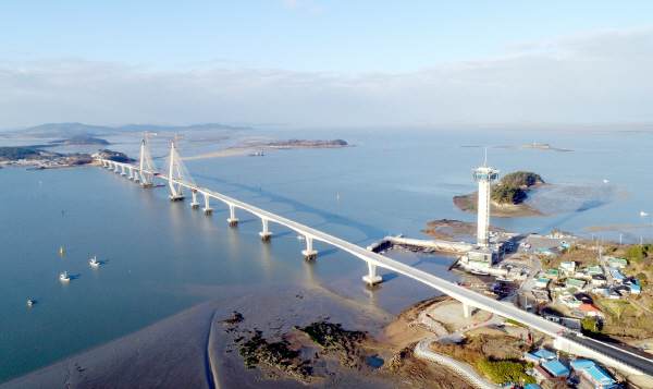 2019년 새해를 맞은 향화도항에는 광활한 칠산바다를 배경으로 111m 높이의 칠산타워가 우뚝 솟아 있으며, 건설 중인 칠산대교는 마지막 상판 연결을 기다리고 있다. 새해 상판이 연결되면 무안에서 5분이면 염산 향화도항을 방문할 수 있다. /사진제공 영광군