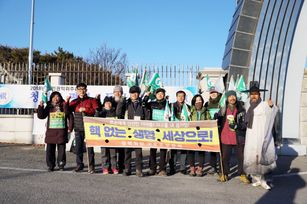 2013년 6월부터 6년 동안 영광은 물론 전국 6,010km을 돌며 핵발전 중단을 외쳤던 ‘탈핵희망도보순례단’이 ‘영광핵발전소안전성확보를위한공동행동’과 함께 24일 오전 한빛원전 앞에서 핵폐기를 주장했다. 이들은 ▲한라에서 백두까지 핵없는 한반도의 조속한 실현 ▲핵발전소 포함한 한반도와 지구의 완전한 비핵화 ▲2030년대 탈핵을 목표로 탈핵정책 수정 ▲부실공사 영광핵발전소 3·4호기 즉각 폐쇄 ▲영광핵발전소 부실공사, 품질·규제실패 등 철저 조사 ▲고준위핵폐기물 제대로 된 공론화 ▲적극적 자연에너지 개발 등을 요구했다.