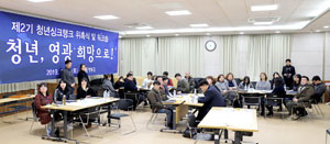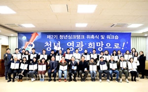 청년싱크탱크 2기가 출발했다. 출범식과 함께 열린 워크숍에서는 1기 청년 싱크탱크 활동 보고와 앞으로의 활동방향 등을 논의 하는 자리가 펼쳐졌다. 워크숍에 이어 청년싱크탱크 2기를 이끌어갈 대표와 부대표, 일자리·문화·복지·교육 4개 분과 위원장을 선출하고 구성원에게 위촉장도 전달됐다. 제2기 청년싱크탱크 임원은 이형준 대표, 노재희 부대표와 일자리 분과장에 양광태, 문화 분과장 장미희, 복지 분과장 이창주, 교육 분과장 김윤정씨 등을 선출했다.
