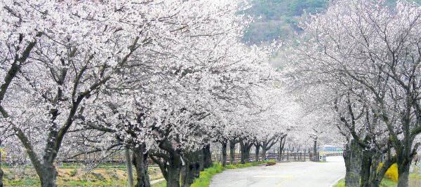 상사화로 유명한 불갑 ‘청년의 길’에 벚꽃이 만개했다. 영광 벚꽃은 타 지역에 비해 늦게 개화한다. 영광의 관광 1번지 백수해안도로의 벚꽃은 오는 20일께나 만개할 것으로 보인다. /곽일순 사진 전문가