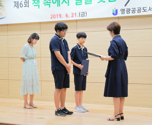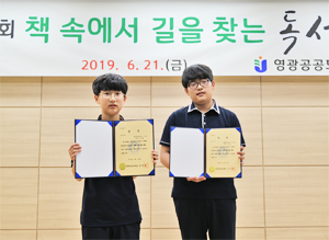 영광공공도서관에서 지난 21일 열린 ‘제 6회 책 속에서 길을 찾는 독서토론대회’ 현장을 찾아가 보았다. 사진은 최우수상을 수상한 오승윤·이주형 학생.
