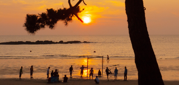 개장을 일주일 정도 앞둔 가마미 해수욕장에 철 이른 피서객들이 찾아 들었다. 소나무 숲과 아름다운 석양을 배경으로 학생들이 장마철 틈새를 파고든 더위를 식히고 있다. /곽일순 사진 전문가