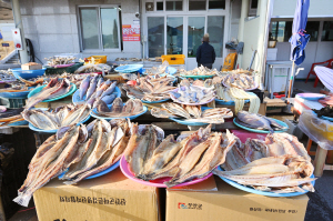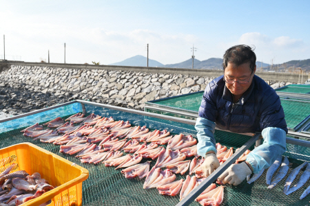 원앙건어물의 대표 부부는 생선 건조 작업에 한창이다. 설도 앞바다를 배경으로 직접 하나하나 깔끔하게 손질한 생선을 잘 펴서 겨울 찬바람에 맡긴다. 여름에는 하루 반, 해가 짧은 겨울엔 3일에 걸쳐 말리면 알맞게 잘 마른다.