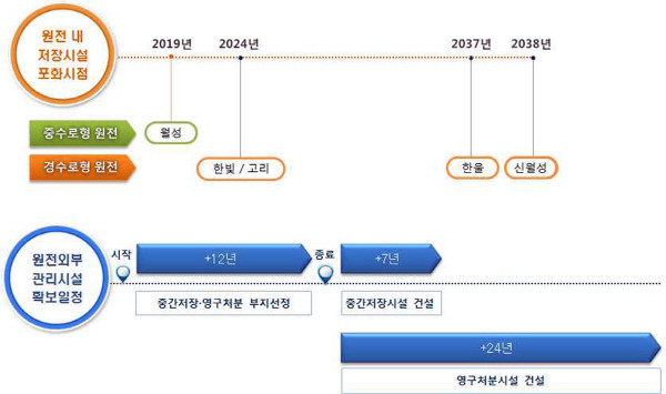 당시 공론화위원회는 경주시 월성원전은 2019년, 기장군 고리원전은 2028년, 영광 한빛원전은 2024년, 울진 한울원전은 2026년을 부지 내 임시보관 포화시점으로 예측했다. 이미 경주 월성원전은 포화시점을 경과하였지만 가동을 중지하는 상황까지는 발생하지 않았지만 그 시기가 멀지 않았다는 데는 이견을 갖고 있지는 않다. 현재 재검토위원회의 운영에 대해 경주를 제외한 원전지역이 거부하고 시민환경단체가 반대하고 한편에서는 이번 재검토위원회가 모든 것을 다시 논의하기 보다는 전에 마련된 기본계획을 뼈대로 문제점만을 보완하는 것이 현실적이라고 주장하고 있다. 현 상황에서 어느 주장이 합당한지를 판가름하기 어려우나 이미 발생한 사용후핵연료는 미래세대에게 부담을 전가할 수 없는 현세대가 해결해야 할 문제임은 분명하다. 사용후핵연료 처분방식을 구체화하기까지 수 십 년이 걸릴 수 있는 만큼 논의를 서둘러야 하나 조급함으로 국민적 공감대가 없는 공론화 재검토가 되어 차기 정부에서 다시 백지화 하는 상황을 만들어서는 안 된다.