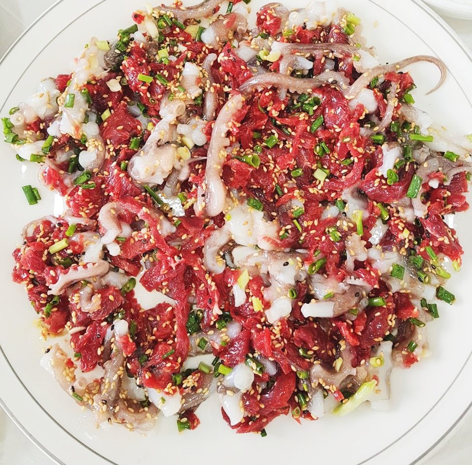 특히, 붉은 한우와 하얀 낙지를 칼로 탕탕탕 잘게 썰어 무친 ‘한우낙지탕탕이’는 군침이 절로 돈다. 매일 아침 받아오는 쫀득한 생고기와 수족관에서 관리하는 야들야들한 산낙지는 환상궁합을 자랑한다. 나른한 봄철에 기력 보충과 원기회복에 더할 나위 없다. 잃어버린 입맛 북돋우는 데 최고인 산낙지 초무침은 금상첨화. 거기에 산낙지비빔밥과 산낙지매운탕까지 꿈틀대는 싱싱한 산낙지를 일년내내 맛볼 수 있다.