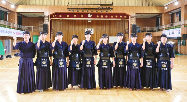 해룡고 검도부 선수들이 8·15 광복절기념 문화체육관광부장관배 제49회 전국학생검도대회에서 단체전 준우승을 차지했다. 김창근 감독(왼쪽)과 9명의 선수들.