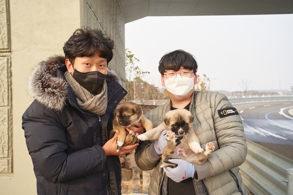 대마산단 내 e모빌리티연구센터에서 귀여운 강아지들에게 애정을 헌납할 주인을 급구한다. 사진은 왼쪽부터 김도현 팀장과 신현택 연구원의 모습.