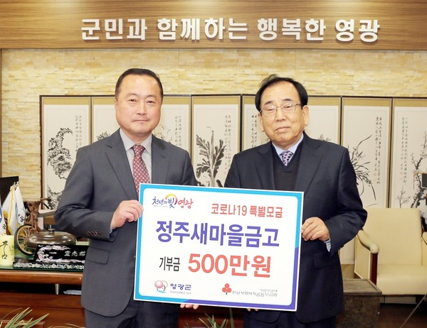2020년 코로나19 확산 방지와 지역경제 활성화를 위해 이사장 취임식을 취소하고 예산비용 500만원을 코로나19 특별성금으로 영광군에 기탁하였으며 마찬가지로 대신지점 개소식 예산비용 300만원도 위기가정 2곳에 성금으로 전달했다. 또한, 코로나19로 인한 착한임대인 국가사업에 동참하며 우리 새마을금고 임차인들에게 월 임대료 30%를 3개월간 할인하였다. 매년 진행하는 사랑의 좀도리운동은 임직원 후원 300만원과 금고예산 250만원 등 총 550만원을 복지시설과 개인대상자 23명에게 현금과 쌀로 지원하였고 연간 지급하는 장학금 200만원 역시 어려운 학생에게 전달했다. 그 외에도 산악회 지원, 노인회관 유류비 지원 등 꾸준히 지역사회발전에 이바지하고 있다.