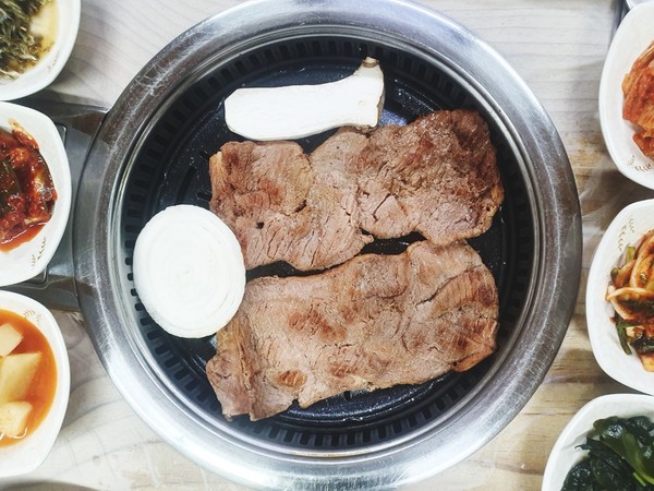 넓적한 갈비를 불판에 잘 구워 먹기 좋게 가위로 자르고 고기 한 점을 한 입에 쏙 넣으면 담백하고 달착지근한 맛이 입안에서 살살 녹는다. 짝 감기는 맛과 입안 가득 감도는 양념 맛이 상당히 매력적이다.