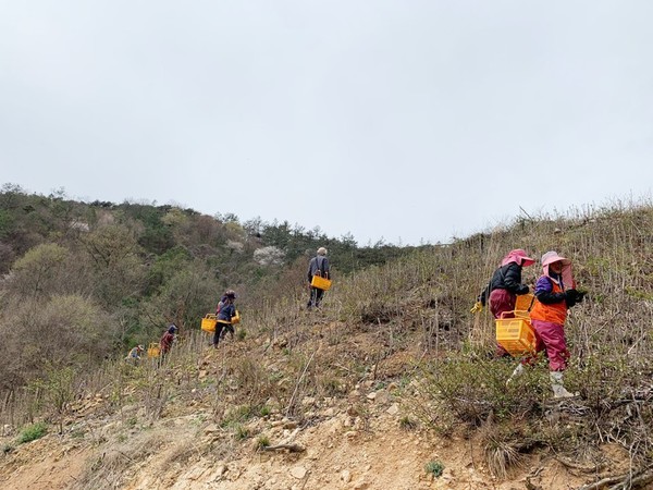 묘량면 삼척리 산 중턱에 수만 그루의 두릅나무들이 아직 서늘한 봄바람을 맞고 있다. 나뭇가지마다 꼭대기가 휑하다. 지난 3월 말에서 4월 초 쯤에 1차 수확이 이미 끝난 상태다.