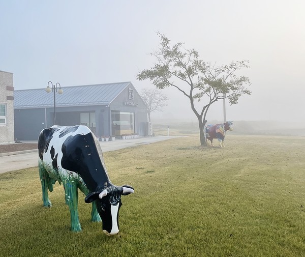 좁은 논길을 따라 목장에 들어서니 넓게 깔린 잔디밭 위에 화려하게 색칠된 젖소 조형물 2마리가 눈에 띈다. 독일에서 치즈 만드는 기계를 구입하며 함께 실어온 작품이다. 날씨가 좋을 때는 젖소들이 방목장에 나와서 풀을 뜯는 모습도 볼 수 있다.