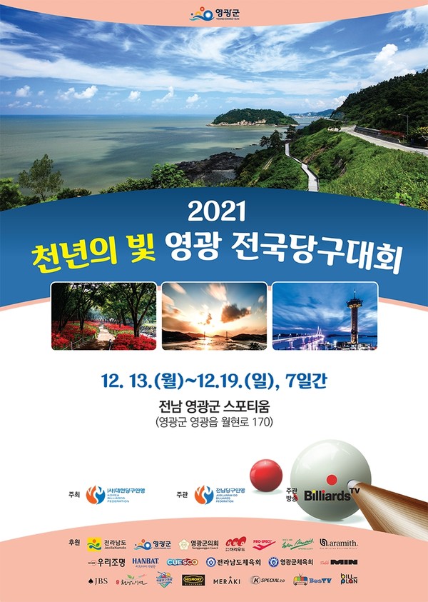 영광군은 국민체육센터에서 오는 13일부터 19일까지 ‘2021 천년의 빛 영광 전국당구대회'가 개최된다고 밝혔다. 이번 대회는 전국의 임원과 선수 2000여명이 참가한다.
