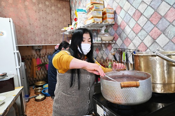 단골 어르신들 유난히도 추운 올 겨울 따뜻하게 보내시라고 몇 인분인지도 모를 많은 양의 팥죽을 쑤기 위해 양 씨는 새벽4시부터 팥을 삶았다. 2년 만에 모처럼 딸이 해준 머리를 혹시나 자국이 남을까 묶지도 못하고 가스불 앞에서 땀을 뻘뻘 흘리며 고생이다.
