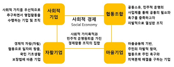 국내 사회적 경제 조직들은 사회적기업, 협동조합, 마을기업, 자활기업 등의 유형으로 구분할 수 있다. 이러한 경제조직 중 공동체와 관련이 높은 것은 마을기업, 협동조합, 사회적기업 순으로 나열해 볼 수 있다.