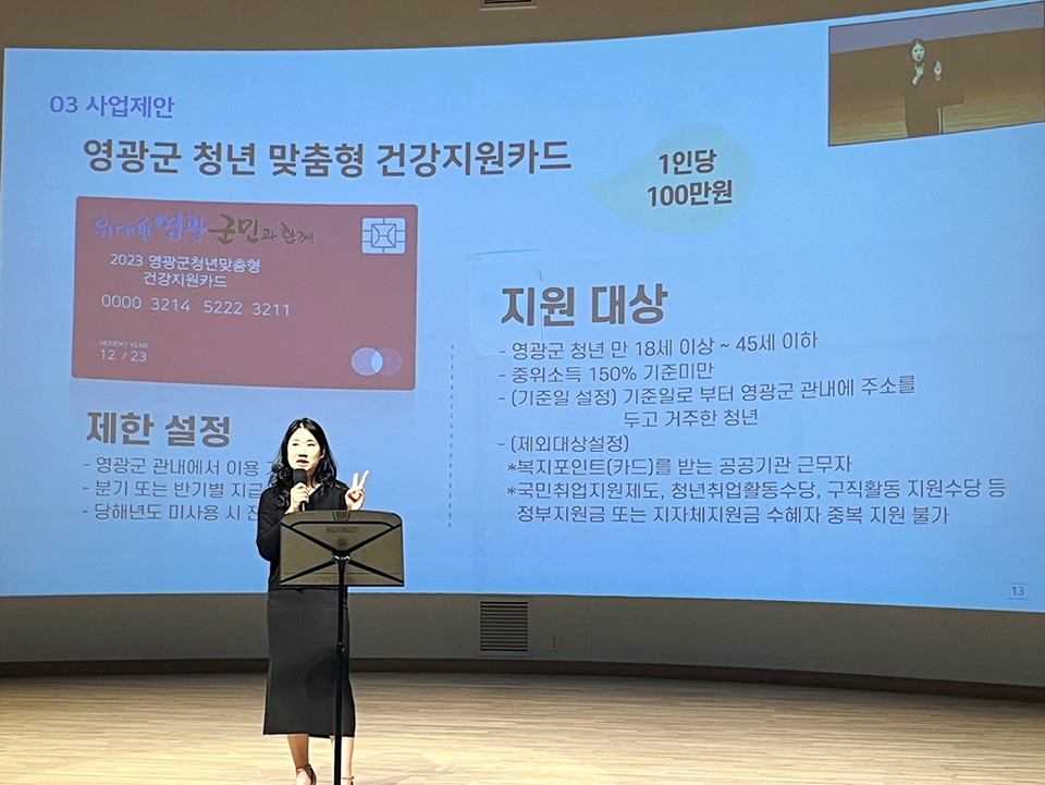영광군이 주최하고 청년지대(이사장 원복성)에서 주관한 영광군 청년정책공모전에서 영광군 청년들이 제안한 다양한 사업들을 기획과 발표를 거쳐 우수 정책으로 시상했다. 청년들에게 필요한 정책을 청년들이 주도적으로 기획하여 만들어내는 과정을 통해 청년들이 정책의 주인이 되고 주민으로서 사회참여역량을 발휘하여 제안된 정책으로 2023년 청년정책에 반영할 수 있는지 검토 중이다. 요즘은 일반 군민들도 정책참여를 위한 역량이 필요한 시기다. 이번 정책제안활동을 통해 청년들이 영광군의 사회참여 수준을 향상시키는 좋은 계기가 된 시간이었다. 이번 기획보도를 통해 청년들이 제안한 정책을 공유하고, 군민의 관심을 향상시켜 청년들의 아이디어가 정책으로 시도되는 좋은 기회가 되기를 바란다. <편집자 주>