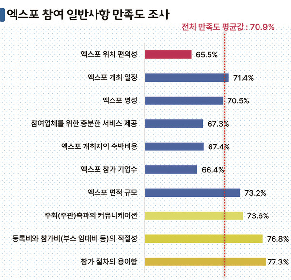 #엑스포 개최 관련 세부 만족도 조사= 참가기업 대다수가 엑스포 참가절차 용이, 참가비용 적정, 주최측과의 원활한 커뮤니케이션에 매우 만족하고 있는 것으로 나타났다. 엑스포 규모 및 개최일정도 대체적으로 적정한 것으로 답변했다. 다만 지역적 한계, 숙박편의 등에서 불편함을 드러냈으며, 엑스포 규모와 참가기업 수를 늘려야 한다는 의견도 있었다.