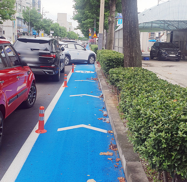 영광읍 시내 곳곳에서는 이-모빌리티 킥보드 우선도로 개설로 푸른 물결(?)을 이루고 있다. 자칫 보면 일렬종대로 자동차가 주행하는 것인지, 아니면 주차 또는 정차되어있는 것인지 헷갈린다. 또한, 킥보드 우선도로 옆으로 일렬종대의 자동차 속에서 눈에 띄는 고문관(?) 자동차도 보인다. 6주간의 신병교육대를 마치면 일렬종대와 횡대가 헷갈리지 않듯이 이-모빌리티 킥보드 우선도로를 이해하는 시간도 아직은 필요할 듯하다.
