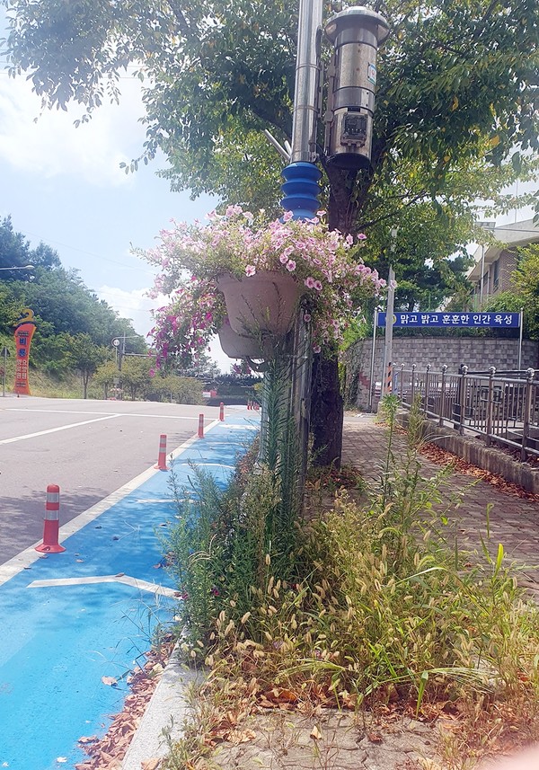 그런데 가로등에 묶인 화분이 언제부턴가 눈높이에서 눈 아래로 내려앉았다. 그 밑으로 잡초가 무더운 여름을 틈타 화분 아래까지 자라고 있다. 화분에 피어 있는 나팔꽃은 화분 크기를 넘어 사방으로 번져 나가고 있으며 아래 강아지풀은 하루가 다르게 쑥쑥 자라 화분에 피어 있는 나팔꽃과 한 묶음으로 보여 자칫 새로운 식물의 탄생을 알리는 순간을 보는 것 같다.