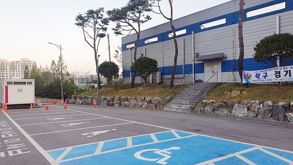 물무산행복숲 공영주차장에 지난 9일 토요일 ‘의문’의 이동식 화장실이 자리를 차지했다. 이동식 화장실 옆에는 탁구경기장이라는 현수막이 걸렸다.