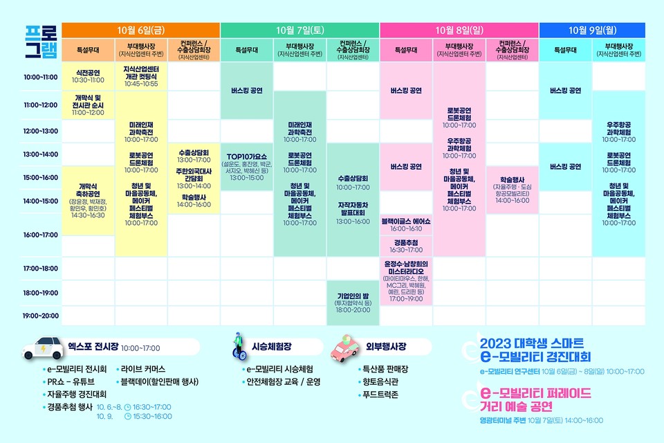 #e-모빌리티 경진대회= 대학생 스마트 e-모빌리티 경진대회는 6일부터 8일까지 3일간 대마산업단지 내 e-모빌리티 연구센터 주행시험장에서 열린다. 전국 80개 팀 1,500여 명이 참가하며 대학생들이 직접 만든 자동차로 경연을 펼치는 대회이다. 대학생들이 1년 동안 직접 설계 및 제작한 전기자동차의 기술 수준과 성능을 겨루는 경연의 장으로 미래자동차 산업 분야를 이끌 핵심인재의 발굴과 육성을 위해 열리고 있다. 또한, 7일 오후 2시부터 엑스포 분위기 조성을 위해 경진대회 참가차량과 농업용 전기차, PM 등 80여대의 행렬이 어우러진 e-모빌리티 퍼레이드는 예술의전당을 시작으로 영광종합터미널과 한전회전교차로 구간까지의 코스로 펼쳐진다.
