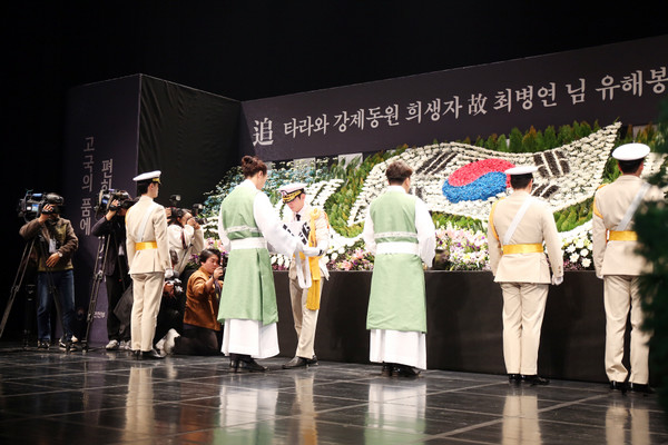 1942년 24살에 가족을 두고 일본 태평양 전쟁에 끌려가 1년만에 희생된 故 최병연씨 유해 봉환 추도식. 채종진 기자 admin@ygnews.co.kr 다른기사 보기 저작권자 © 영광신문 무단전재 및 재배포 금지 당신만 안 본 뉴스 제5회 영광 디카시 공모전 지상전 ‘光風’으로 나누는 기본소득 ‘국회의장상’ 권혁범 여민동락공동체 대표 영광키즈카페 어디에 어떻게 짓나? 수능시험 무사 종료 학생수 감소 심각 햇빛·바람이 만드는 영광의 미래 ③ 분산에너지특구 기회의 문 열렸다 제5회 영광 디카시 공모전 지상전 댓글삭제 삭제한 댓글은 다시 복구할 수 없습니다. 그래도 삭제하시겠습니까? 비밀번호 닫기 기사 댓글 0 댓글 접기 로그인 후 이용 가능합니다. 댓글 내용입력 비회원 로그인 이름 비밀번호 댓글 내용입력 댓글쓰기 계정을 선택하시면 로그인·계정인증을 통해 댓글을 남기실 수 있습니다. 회원 로그인 비회원 글쓰기 이름 비밀번호 자동등록방지 로그인 옵션 창닫기 주요기사 생사의 기로에... 장세일 군수, 이재명 대통령과 ‘邂逅’ ‘햇빛바람 기본소득’ 한번 더, 전국무대 알렸다 ‘아이디어 돋보인’ 구수‧대신 어촌계 ‘대상’ 마을 빈공간 활용 태양광 ‘발전수익’ 고리 2호기 수명연장 승인에 ‘촉각’