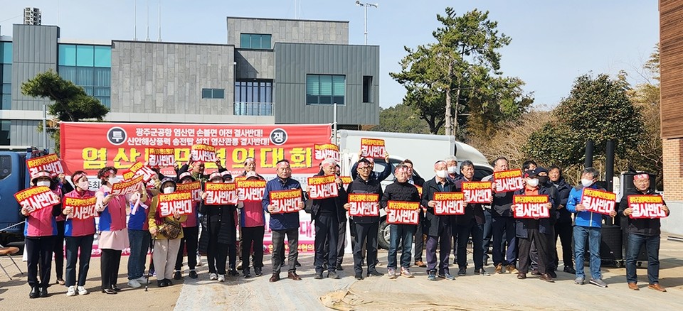 염산면번영회 등 19개 단체로 구성된 염산면발전협의회가 3월 광주군공항 이전 반대 결의대회를 열었다. 협의회 측은“함평에 전투비행장 문제가 거론되자 우리 영광을 부채질하는 사람들이 나타났다”며 “피해를 우려했고, 유치단체 측은 영광은 피해만 보고 지원은 함평으로 돌아간다며 차라리 영광에 유치하자는 논리였다. 내부 갈등이 커지자 지역사회는 전투비행장은 지자체장이 신청해야 평가가 시작되는 점을 강조하며 강종만 군수의 판단에 이목이 쏠렸다. 강 군수에게 입장을 확인한 결과 ‘단서 없이 반대한다’고 밝혀 이후 사실상 일단락 됐다.