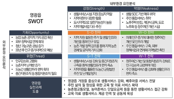 영광군이 전문기관을 통해 읍면별 강점·약점·기회·위협 요인 등 SWOT 분석을 실시한 결과 11개 읍면 중 영광읍은 생활서비스 시설 지원의 중심지 역할을 하며 지역자원의 다양한 활용과 도시지역으로 발전가능성이 높고, 다수의 지역개발 사업을 추진하는 강점을 지녔다. 또한, 농업 농촌의 공익적 가치와 외부 정책사업 연계 확대 및 청년 귀농 귀촌에 대한 관심이 증가해 30년 후 인구가 증가할 수 있다는 기회 요인은 긍정적이다.