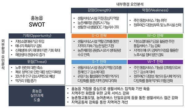 영광군이 전문기관을 통해 읍면별 강점·약점·기회·위협 요인 등 SWOT 분석을 실시한 결과 11개 읍면 중 홍농읍은 생활서비스시설 지원 중심지 역할과 농촌체류형 관광도시 기능, 생활권 내 생활 SOC 기능지수 2위 등이 장점으로 나타났다. 또한, 지방소멸기금 투입과 에너지 특화지구 검토, 신재생에너지 확대, 해양생태 관광수요 증가 등은 기회요인이다. 반면, 주민통합서비스 기능이 취약하고 정주여건 다양성 부족 및 노후시설 산재는 약점이며, 노후 원전 축소 및 폐로 대응 방안 미확정, 30년 후 인구감소지역 예상, 먼거리 위협 증가 등은 위협요인이다.
