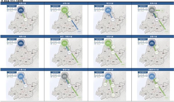 특히, 보육·교육·복지·문화·체육 등 12개 분야 시설을 지역 내에서 이용하는지 아니면 외부에 의존하는 지 내·외부 이용률을 분석한 홍농읍 서비스 이용 현황은 다소 나은 편인지만 풀어야 할 과제가 많다. 분야별로 홍농읍 내부에서 서비스를 이용한 비율을 분석한 결과 체육시설은 100%, 금융시설은 92.6%, 보육시설은 83.3%로 상당히 높게 나타났다. 또한, 휴게시설 67.6%, 복지시설과 교통시설이 각각 66.7%, 생활편의시설 61.1%, 보건·의료시설 59.3%, 상업시설 53.4% 등은 절반 이상으로 나타났다. 반면, 지역 내 교육시설 이용비율은 46.7%, 행정시설은 36.7%, 문화시설 27.5%에 불과했다.