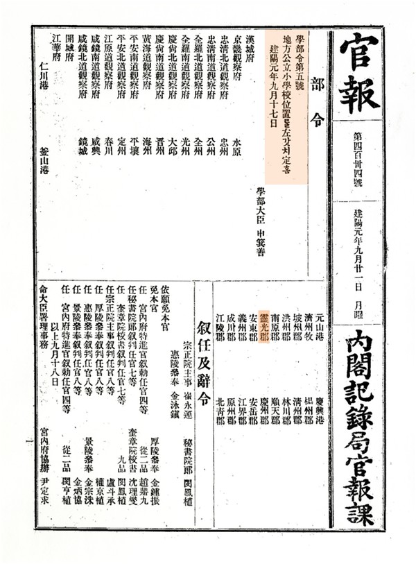 <官報 424호> 학부령 제5호 지방공립소학교의 위치를 정함(1896.9.21.)