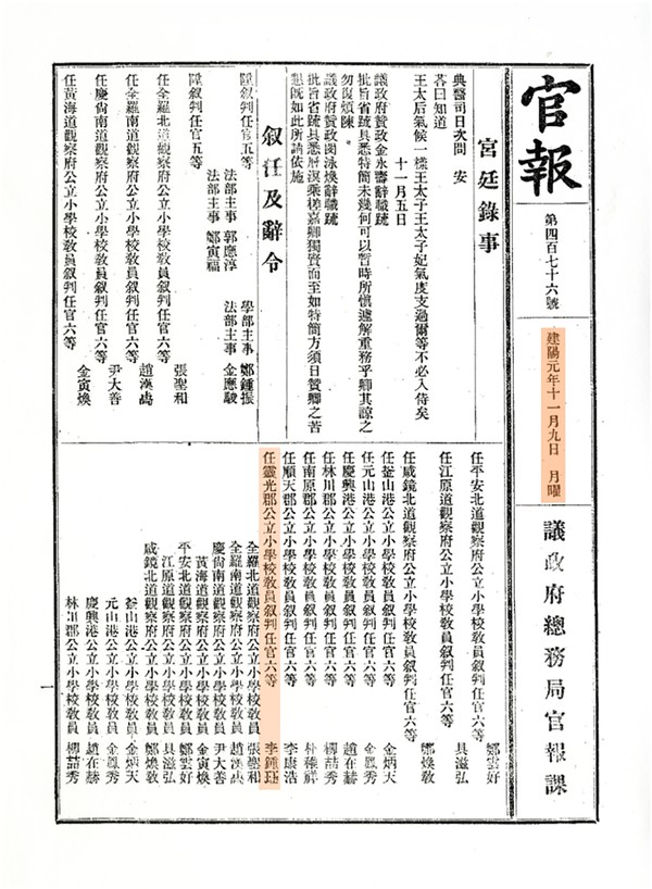 영광군공립소학교의 설립은 1896년 9월17일에 공포된 학부령 제5호 「지방공립소학교 위치를 정함」에 의거하여 공립소학교가 설치되는 전국 38개 도시에 영광이 포함되었다는 내용을 관보<424호>를 통해 확인할 수 있고, 동년 11월에 6일에 영광군공립소학교 교원에 이종각이 임명되었다는 사실을 관보<476호>를 통해 확인할 수 있다.