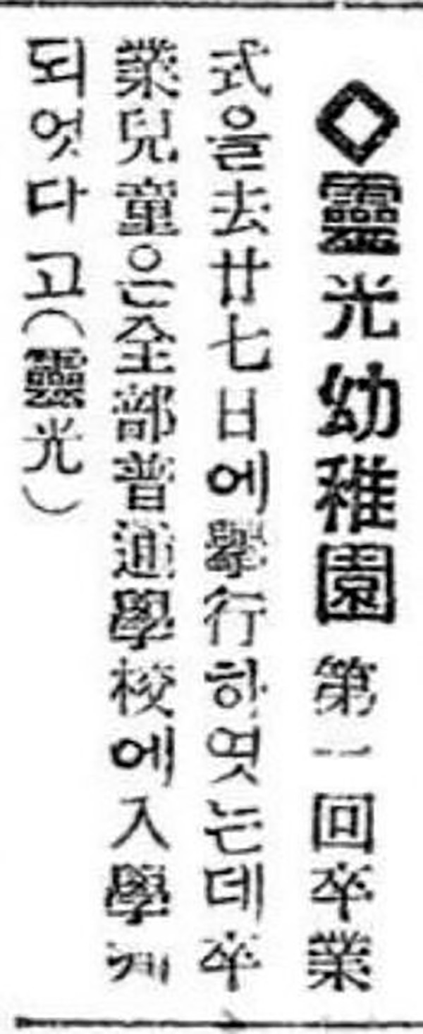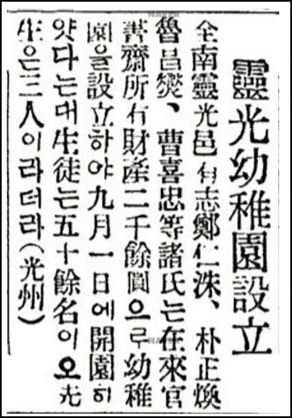 전남영광읍 유지 정인수, 박정환, 노창섭, 조희충 등이 관서제 소유 재산 2천여원으로 유치원을 설립 하야 9월 1일에 개원하였고, 생도는 50여명, 선생은 3명이다. (동아일보,1921.9.7.)