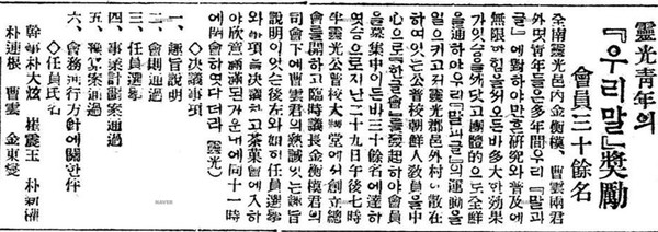 전남영광읍 김형모, 조운 등 청년들이 “우리말과 글” 운동을 일으키기 위해 영광각지의 공립보통학교 조선인 교원을 중심으로 조직하여 30여명이 영광공립보통학교에서 발기식을 가졌다는 내용이다.(조선일보, 1927.2.2.)