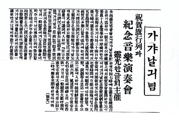 영광공립보통학교에서 가갸날 기념식을 거행하였는데, 장내에는 여러가지 표어와 훈민정음 반포시의 세종대왕친서 등을 걸고 주악과 가갸날 노래로 개막한 후, “세종대왕과 훈민정음 반포”, “가갸날의 의의”, “문맹퇴치운동”이라는 주제로 연사들의 연설을 들은 후, 5백여명의 소년소녀가 앞장을 서고, 천여군중이 각기 표어를 담은 기를 들고 악대를 선두로 하여 주악과 함께 가갸날 노래를 부르고 영광읍내를 일주하면서 선전삐라 수천매를 살포하였으며, 오후 7시부터는 12시까지 가갸날 기념 음악연극회 개최했다는 내용이다.(동아일보,1927.10.27.)