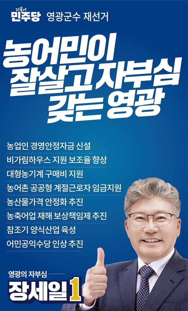 영광신문은 오는 10월16일 영광군수 재선거를 앞두고 군수 출마 후보들의 공약을 1회 ‘농·축·수산·임업’, 2회 ‘노인·장애인·여성·청소년·청년·교육·복지’, 3회 ‘소상공·미래산업·경제·기타’ 등 3개 분야별로 비교 보도한다. <편집자주>