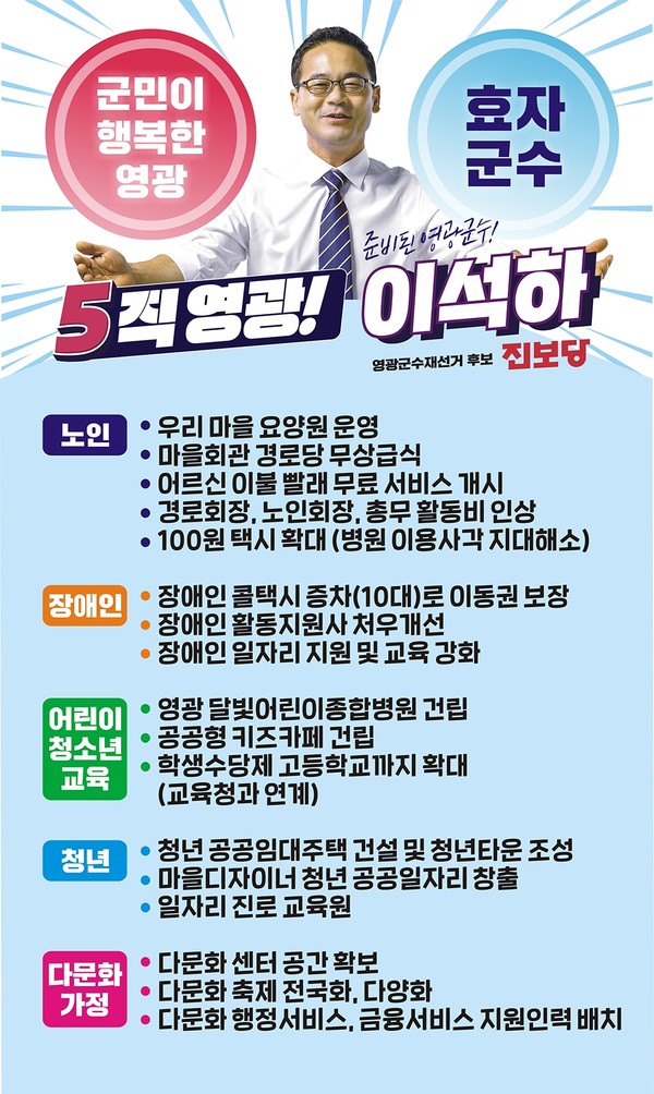 #이석하 후보= 주요 공약은 유치 현실성 문제가 있는 어린이종합병원을 비롯해 경로당 무상급식, 노인회관 건립, 놀이문화복합체험관, 청년농업인 정착비 3억, 농어민 기본생활비 지원, 청년타운 등 가장 많은 정책을 제시하고 있다. 아동, 어르신, 장애인, 청년에 다문화까지 다양한 정책을 아우르고 있다. 다만, 현금성 지원과 시설 건립 등 막대한 예산이 필요한 게 가장 큰 과제다. 부식비와 운영비 일부를 지원하는 경로당에 무상급식을 할 경우 이 정책 만으로도 매년 수백억원이 소요되기 때문이다. 그 외 각종 수당과 생활비 지원, 주택구입비 지원 등 영광군 예산으로 감당할 수 있는지 우려다.