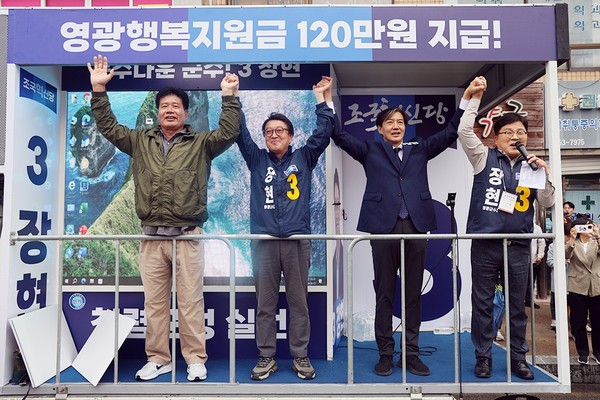 출정식에 참여한 조국혁신당 조국 대표는 “영광행복지원금, 간병비 지원, 대기업 유치 등 영광 발전을 위해 구체적이고 실현 가능한 정책을 만든 장현 후보를 지지해달라”며 “조국혁신당 국회의원 12명 모두 여기 영광을 지역구라 생각하고, 예산, 정책, 인사 등 다방면에서 영광 발전을 위해 함께 노력하겠다”며 고 강조했다.