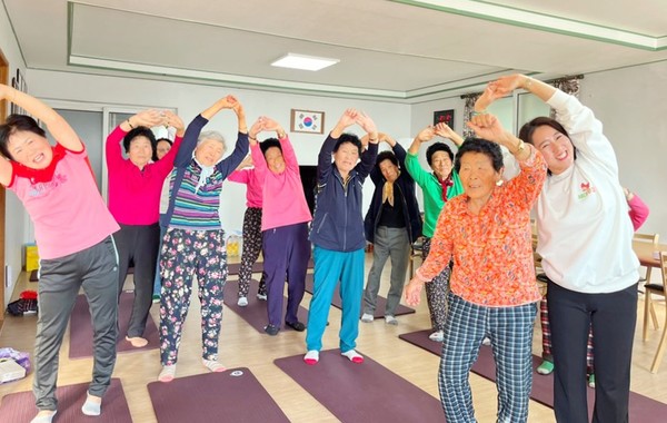 어머니들과 요가를 하면 즐거워요.