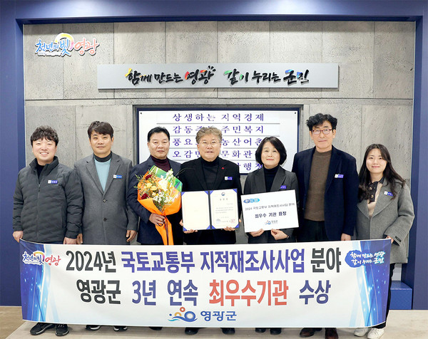 영광군은 구랍 27일 국토교통부가 주관한 ‘2024년 지적재조사사업 지자체 평가’에서 3년 연속 최우수기관을 수상했다고 밝혔다.