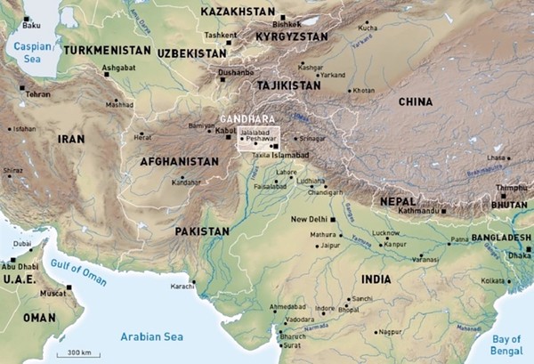 간다라가 처음 알려진 것은 기원전 1500~2000년 경에 쓰인 인도 베다 경전인 리그베다라고 한다. 또 중국 현장 스님이 7세기에 간다라를 방문하여 남긴 기록에 동서가 1,000리, 남북이 800리라고 나와 있다. 간다라지역의 중심부는 현재 파키스탄 카이버박툰카(Khyber Pakthunkawa) 주의 페샤와르를 중심으로 스와트 마르단 디르 바 주, 수도인 이슬라마바드와 인접해 있는 탁실라, 아프카니스탄 잘랄라바드 주변 지역인 베그람 일대이다.