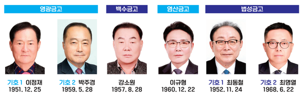 한편, 영광은 4개 금고에서 6명의 이사장 후보가 출마하는 가운데 평균 1.5대 1의 경쟁률을 나타냈다. 영광금고를 포함한 백수, 염산, 법성 등 4곳이다. 이중, 백수금고 강소원(67) 이사장과 염산금고 이규형(64) 이사장은 단독 후보로 무투표 당선을 눈앞에 두고 있으며 규모가 큰 영광금고는 이정재(73) 전 감사와 박주경(64) 이사장이 등록했다. 법성금고는 최동철(72) 현 이사장에게 최명열(56) 전 전무가 도전장을 던졌다.